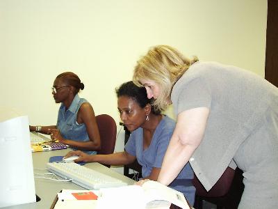 Peggy Wilson (left) works while CRPC's Cynthia Lanius helps Lynette Gomez.